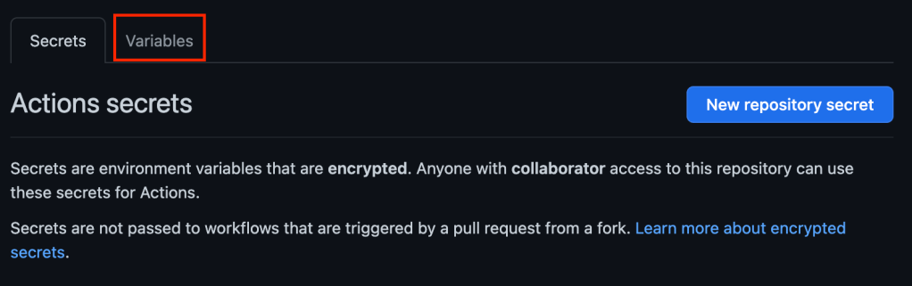 GitHub made it easy to store secrets for your actions at a repository or organization level, which is a critical step to keeping things like passwords and tokens out of plain text in repos. Unfortunately, there was no good way to store less sensitive information like a username or an S3 bucket name. Now GitHub supports variables for Actions as a public beta. The section for managing variables is in a tab next to where you edit secrets. If you didn’t see it at first, don’t worry, it took me a few minutes to find it.